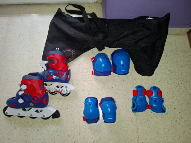 Detalles del productoSet de patines en línea ajustables para tallas 28 a 30, con un diseño en azul y rojo. Incluye un juego completo de protecciones. Además, bolsa para guardar los patines y, otra, para guardar las protecciones.