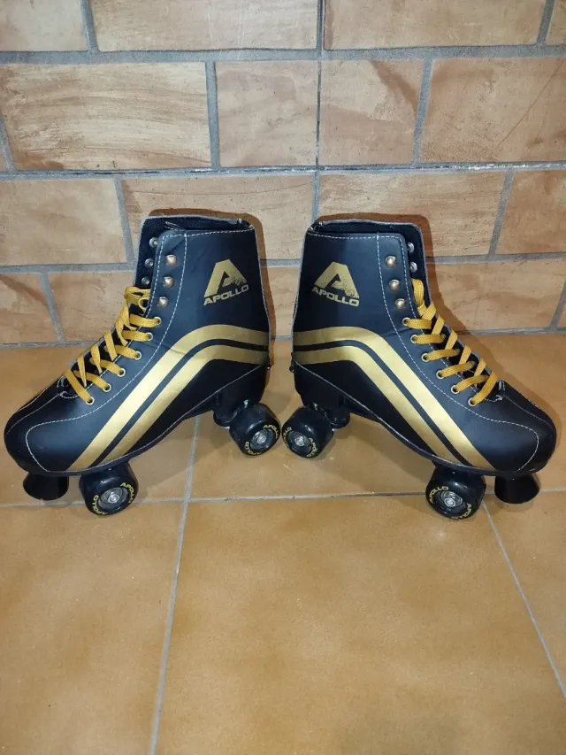 Detalles del productoPatines Apollo talla 39-42 ajustables de cuatro ruedas en negro con detalles dorados.