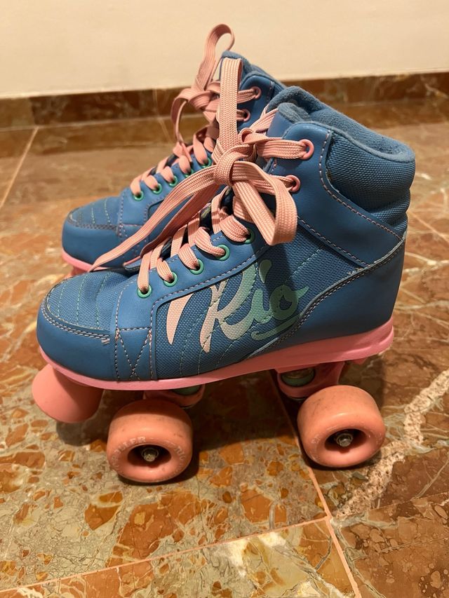 Estos patines artísticos son de color azul con detalles en rosa. - Cordones rosas. - Ruedas rosas. - Diseño con la marca Rio.