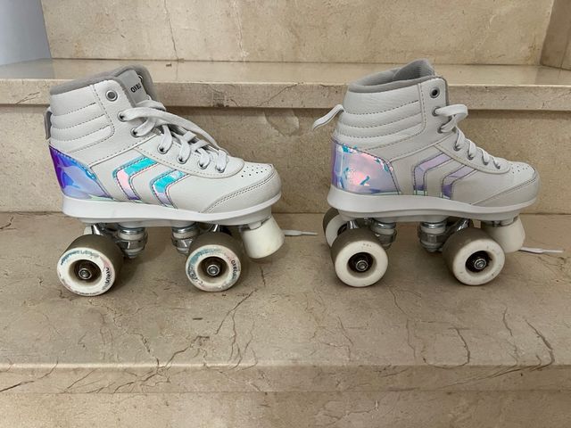 Detalles del productoPatines artísticos blancos de cuatro ruedas con detalles iridiscentes.