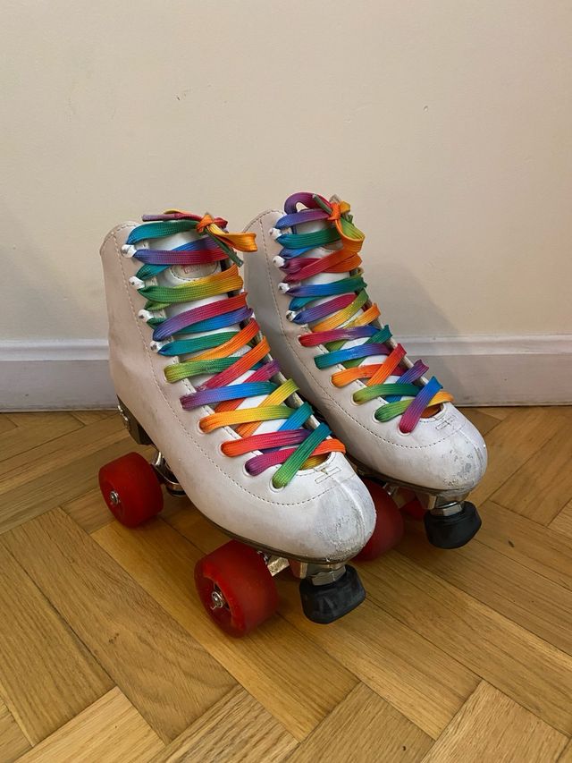 Patines artísticos de color blanco con cordones de colores arcoíris. - Talla 38 - Viene con otros cordones de color blanco - Ruedas rosas