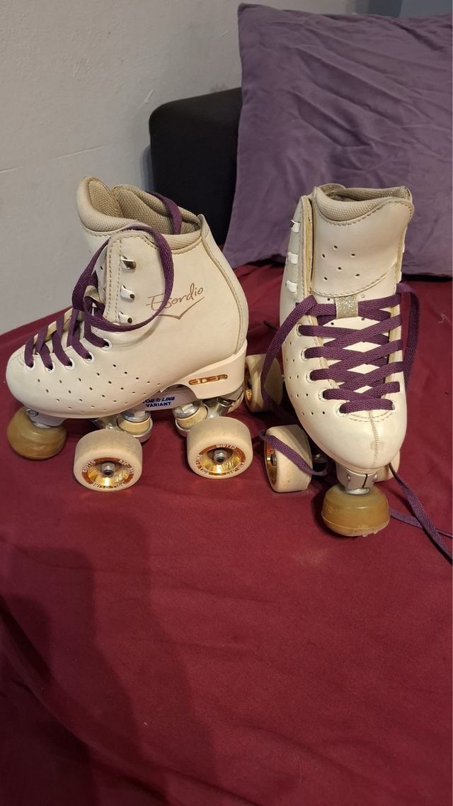 Detalles del productoSe venden patines artísticos de color blanco con cordones morados. Ideales para patinaje artístico.