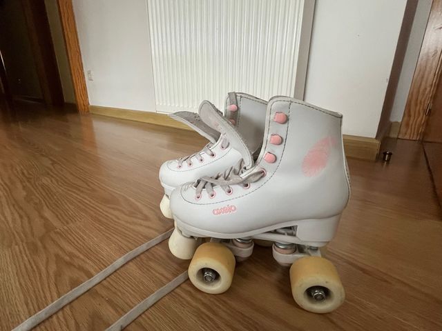 Patines artísticos de la marca Oxelo en color blanco. Diseñados para patinaje artístico. - Cierre con cordones. - Detalle de pluma rosa en el lateral.