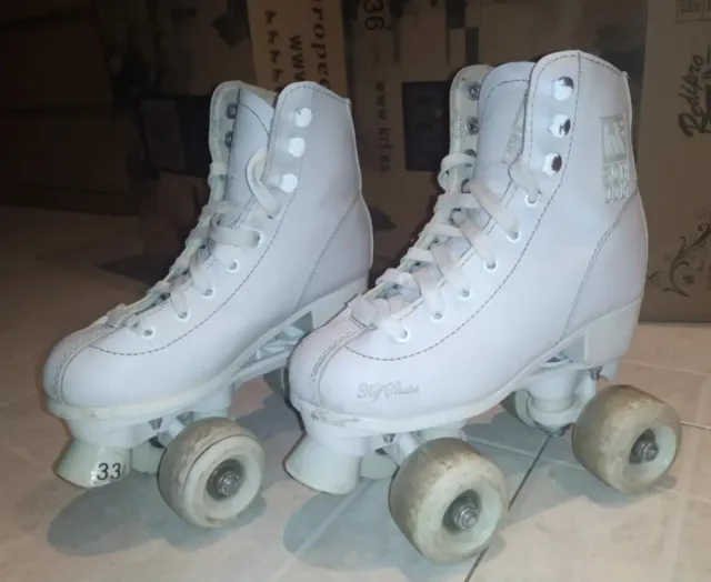 Detalles del productoPatines artísticos KRF de color blanco, talla 33.