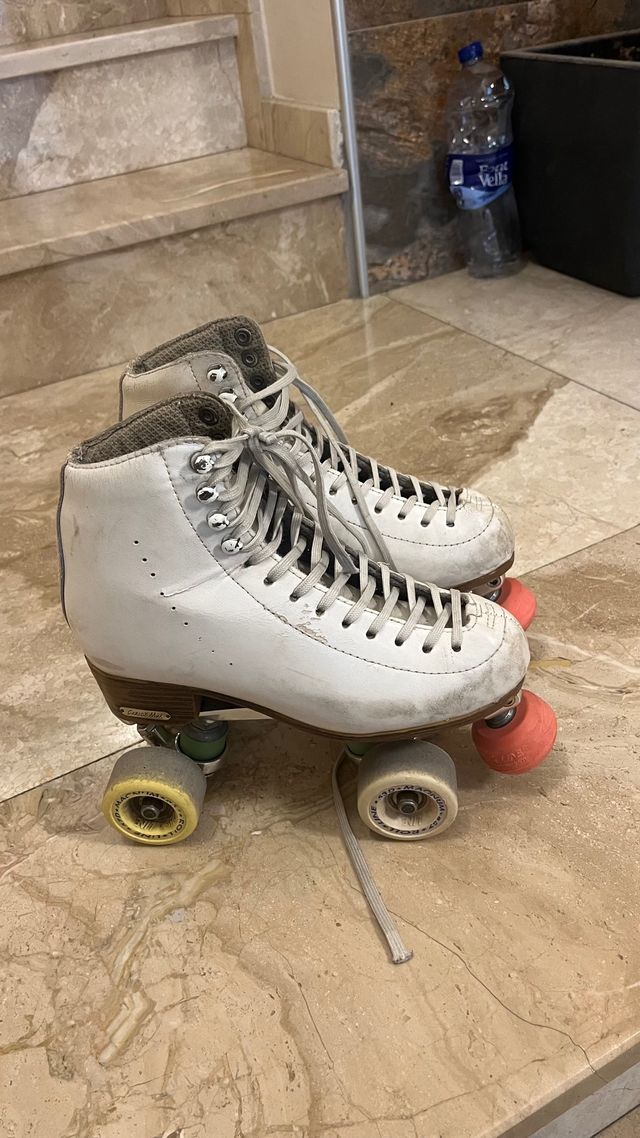 Patines de patinaje artístico en color blanco. - Talla: 36-37 - Cierre con cordones - Ruedas i frenos como nuevas