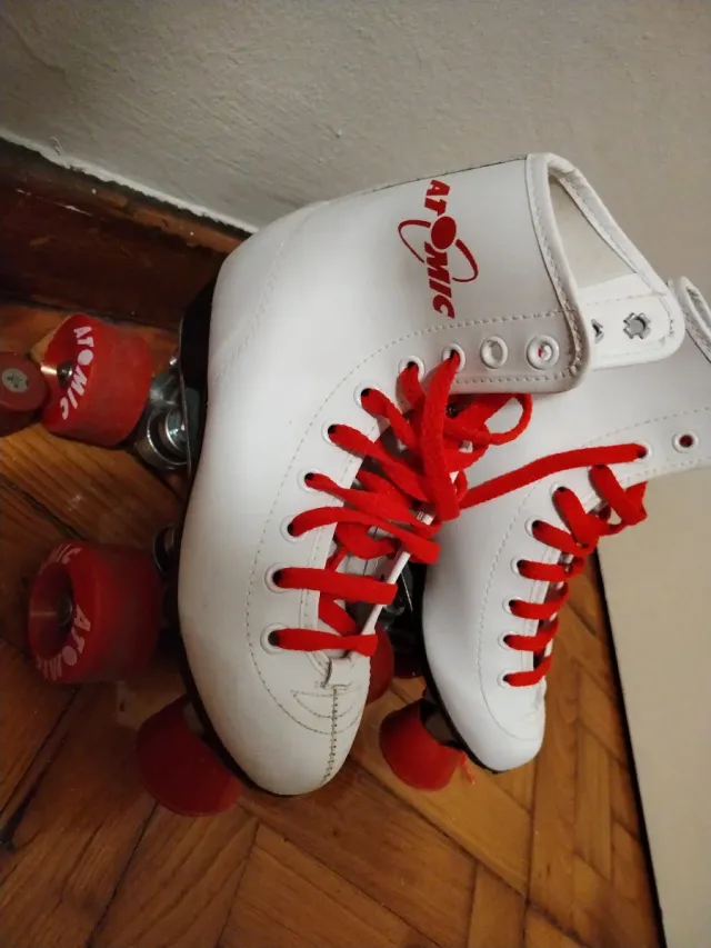 Detalles del productoPatines de cuatro ruedas Atomic en color blanco y cordones y ruedas rojas.