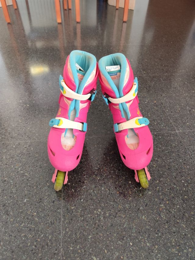 Detalles del productoPatines en línea para niña, en color rosa y turquesa. Están en buen estado, con algunas señales normales de uso. Talla 34