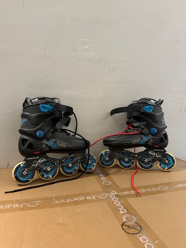 Detalles del productoPatines en línea de la marca BKB, listos para usar. Son de color negro con detalles azules.