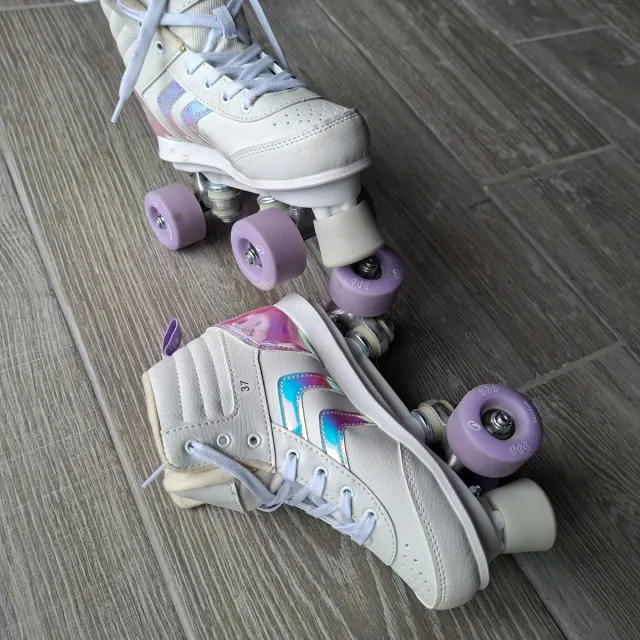 Detalles del productoPatines de estilo urbano en color blanco con detalles iridiscentes en los laterales y el talón. Cuentan con cordones blancos y ruedas de color lila.