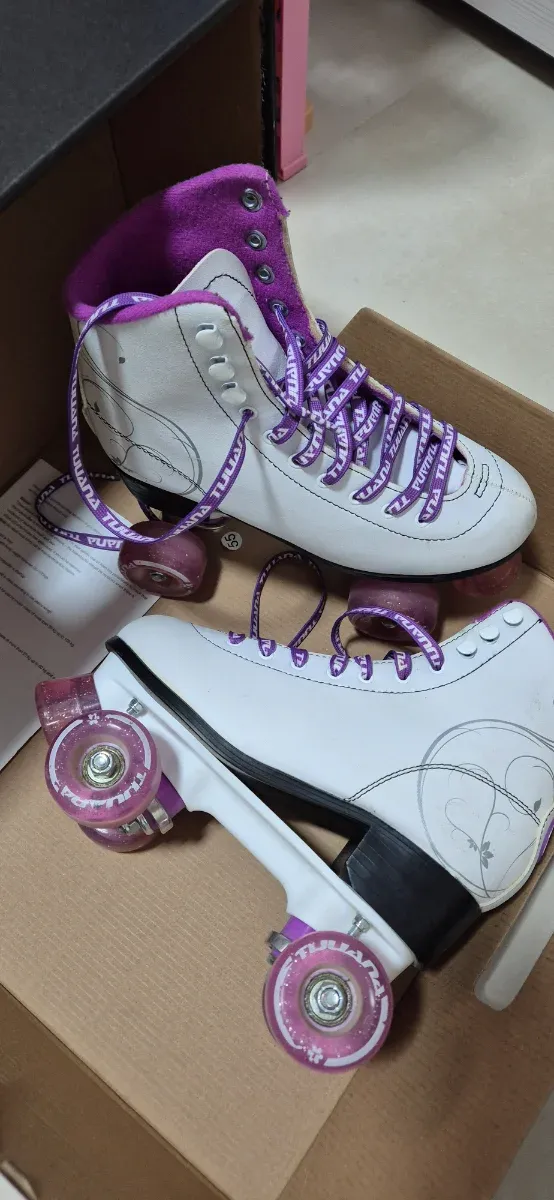 Detalles del productoPatines de estilo clásico en color blanco con detalles en morado. Poco uso y en buen estado.