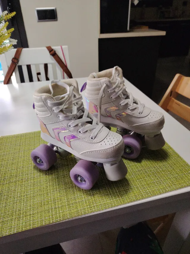 Detalles del productoSe venden patines blancos de caña alta con detalles iridiscentes y ruedas de color morado.