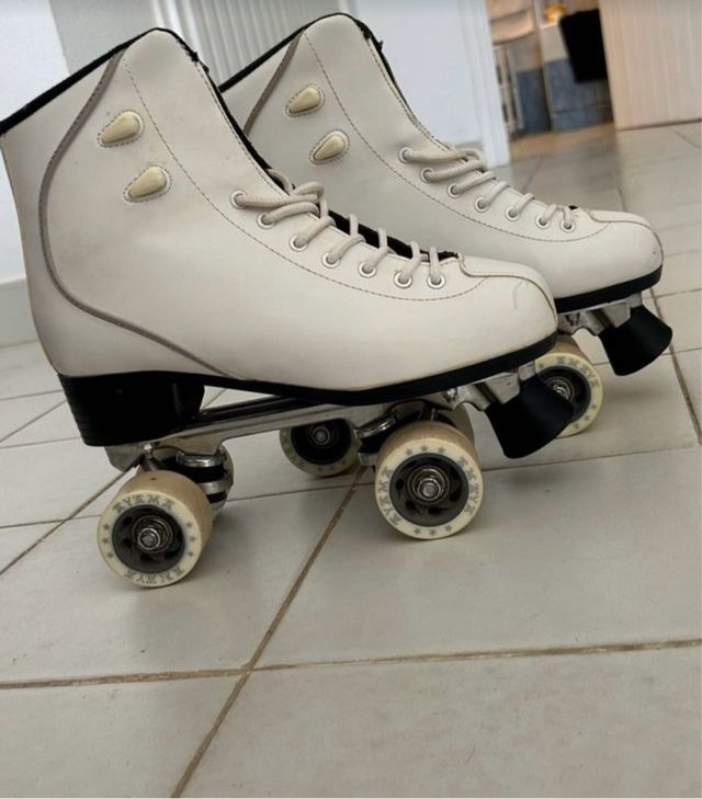 Patines blancos de cuero, perfectos para patinaje. - Diseño alto y clásico. - Cordones blancos. - Ruedas resistentes.