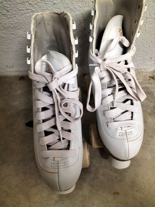 Se venden patines blancos de mujer, perfectos para iniciarse en el patinaje. - Diseño alto tipo bota. - Cordones blancos. - Ruedas de patinaje.