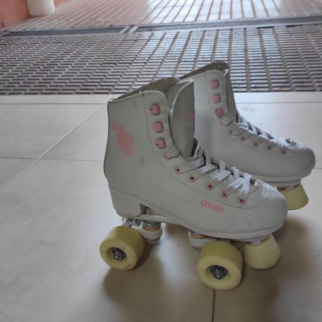 Patines blancos de la marca Oxelo, ideales para iniciarse en el patinaje. - Diseño con detalles en rosa. - Cierre con cordones. - Ruedas amarillas.