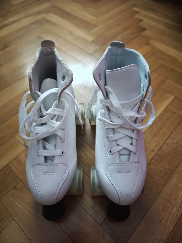 Detalles del productoPatines en línea blancos, ideales para principiantes. Están en muy buen estado y listos para usar. Usados 1 vez.Con luces en las ruedas.Precios nuevos Amazon 55€.