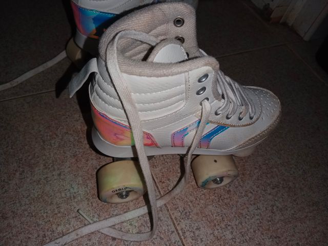 Patines blancos con detalles iridiscentes y cordones. - Talla 32-33. - Diseño alto tipo bota. - Ruedas de color claro.