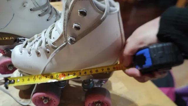 Patines blancos de estilo clásico, perfectos para iniciarse en el patinaje. - Cierre con cordones. - Ruedas de color rosa. - Base y ejes metálicos.