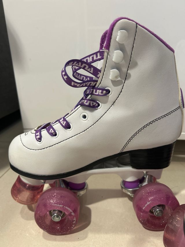 Patines de estilo clásico en color blanco con detalles morados. - Cordones morados con logo. - Ruedas moradas brillantes. - Caña alta para mayor soporte.