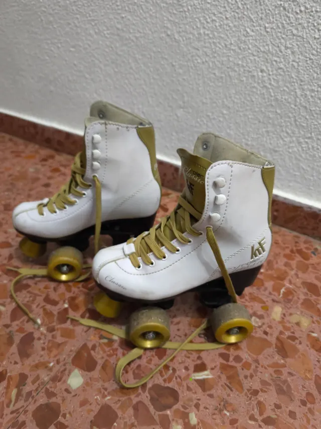 Detalles del productoPatines clásicos de estilo retro en color blanco con detalles dorados. Perfectos para iniciarse en el patinaje.