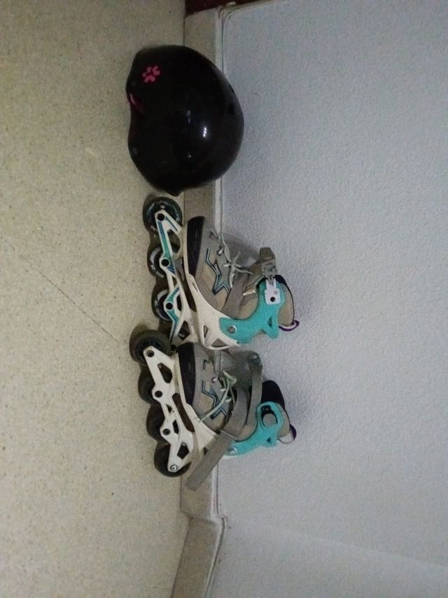 Detalles del productoConjunto de patines en línea con casco protector y rodilleras.