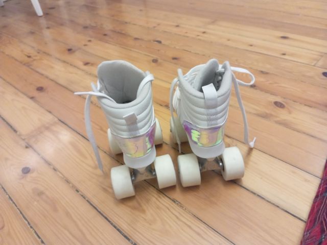 Patines de cuatro ruedas en color blanco, con detalles iridiscentes en el talón. - Cierre con cordones. - Ruedas blancas.