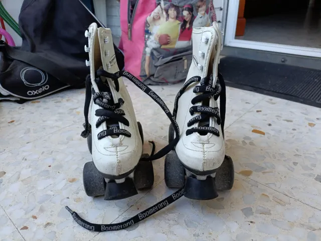 Se venden patines de 4 ruedas en color blanco. - Cordones negros con texto Boomerang. - Ruedas negras. Talla 32