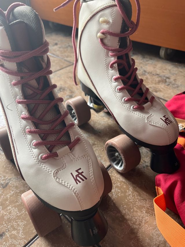 Detalles del productoPatines de cuatro ruedas en color blanco con cordones rosas. Puestos solo una vez.