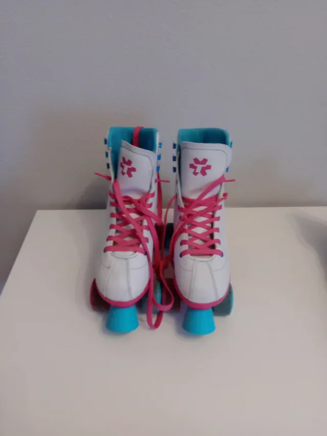 Detalles del productoEstos patines de cuatro ruedas son perfectos para deslizarte con estilo. Su diseño combina blanco, rosa y azul.