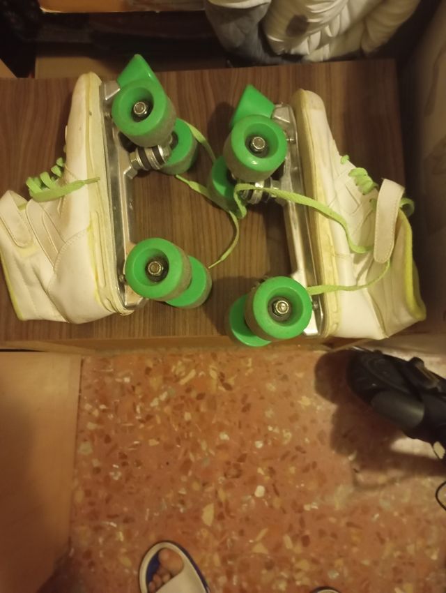 Detalles del productoSe venden patines de cuatro ruedas con zapatillas blancas y detalles en verde.