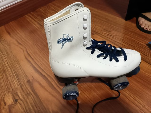 Patines clásicos de 4 ruedas marca California, color blanco con cordones azules.
