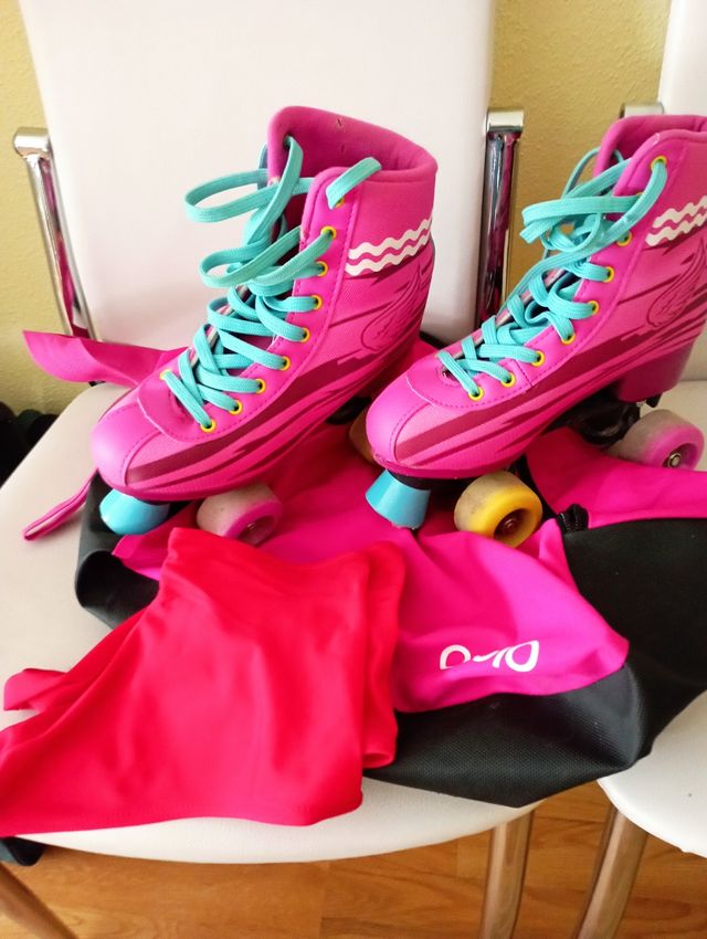 Detalles del productoSet de patines de cuatro ruedas en color rosa vibrante con cordones turquesa. Talla 36-37. Diseñados para niñas, estos patines tienen un estilo llamativo.