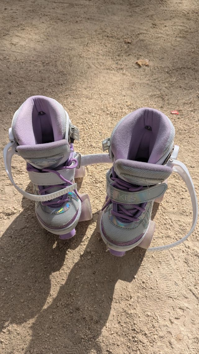 Detalles del productoPatines de cuatro ruedas en color blanco y morado, ideales para niñas.