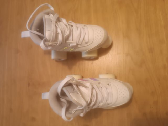 Patines de bota blancos, ideales para los más pequeños. - Diseño deportivo. - Cierre con cordones. - Ruedas resistentes.