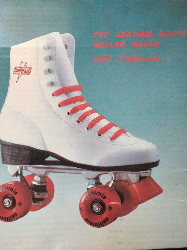 Patines de cuatro ruedas talla 37, de color blanco y cordoneraw y ruedas rojas.