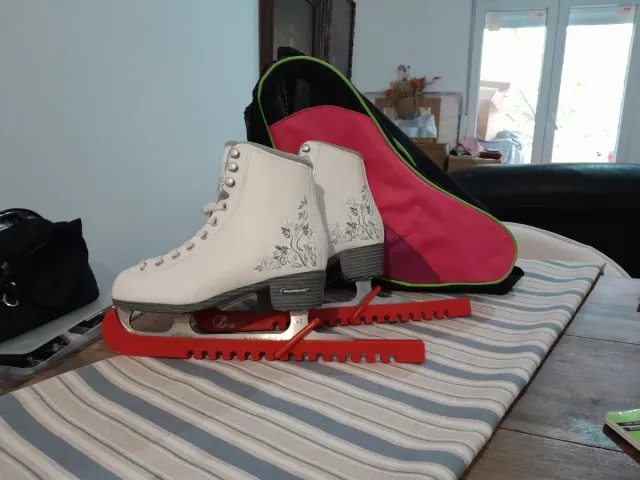 Detalles del productoSe venden patines de hielo blancos con un delicado diseño floral plateado. Regalo protecciones cuchillas, protección botas y bolsa portapatines.