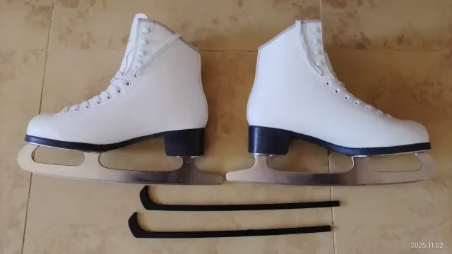 Detalles del productoPar de patines de hielo blancos, ideales para patinaje artístico.