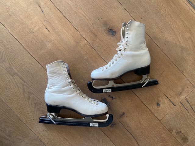 Detalles del productoPar de patines de hielo blancos de diseño clásico. Talle 38. Cierre con cordones. Cuchillas de metal en perfecto estado, como nuevas. Viene con fundas para las cuchillas.
