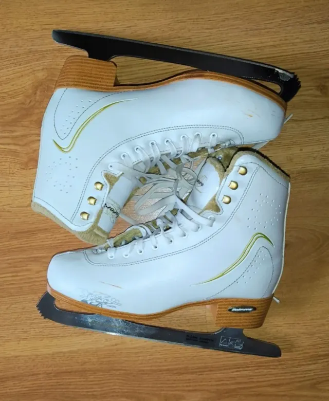 Detalles del productoPatines de hielo blancos, ideales para patinaje artístico o recreativo.