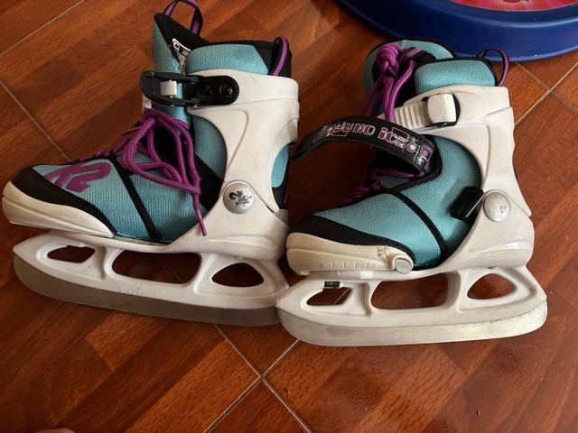 Patines de hielo K2 para mujer, talla ajustable de 36 a 39. - Color azul turquesa y blanco. - Cierre de velcro y cordones. - Cuchillas de acero inoxidable.