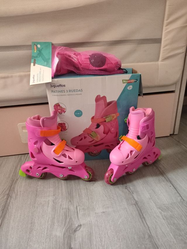 Detalles del productoPatines en linea rosas como nuevos dos puestas lo único que se a perdido uno de los broches de un patín tiene también las protecciones coderas y muñequeras talla ajustable del 29 al 32