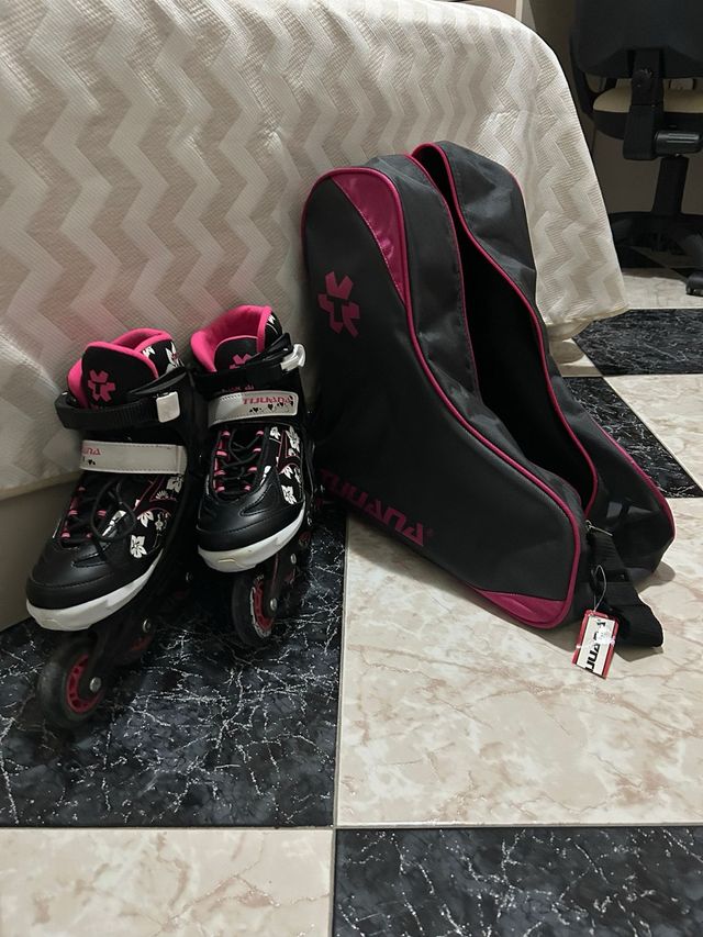 Detalles del productoSet de patines de línea negros con detalles rosas, perfectos para deslizarte con estilo. Incluye una bolsa de transporte a juego.