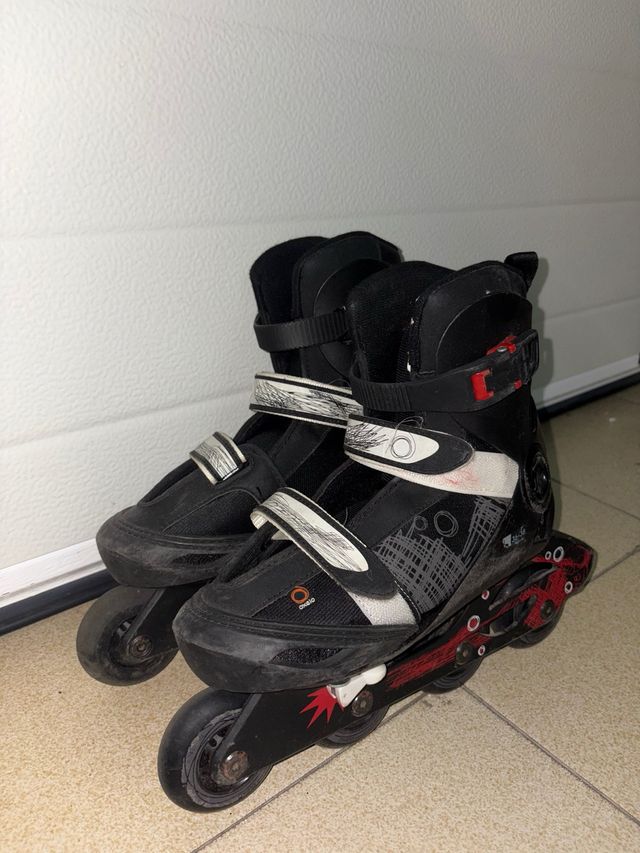 Detalles del productoPatines de línea Oxelo en buen estado, talla 36-38. Son de color negro con detalles en rojo y blanco.