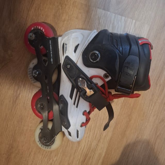Detalles del productoPatines en línea con ruedas rojas y blancas.