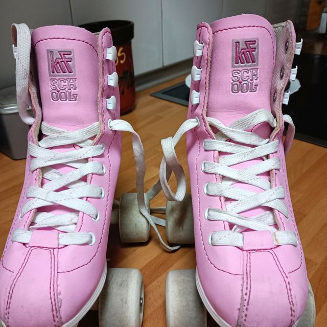 Detalles del productoEstos patines de patinaje son de color rosa. Tienen cordones blancos para un ajuste seguro.