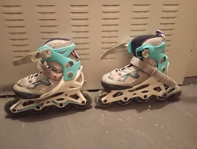 Patines infantiles Oxelo en buen estado, listos para usar. - Dos patines en línea ajustables. - Talla regulable 29-32. - Color gris y turquesa.