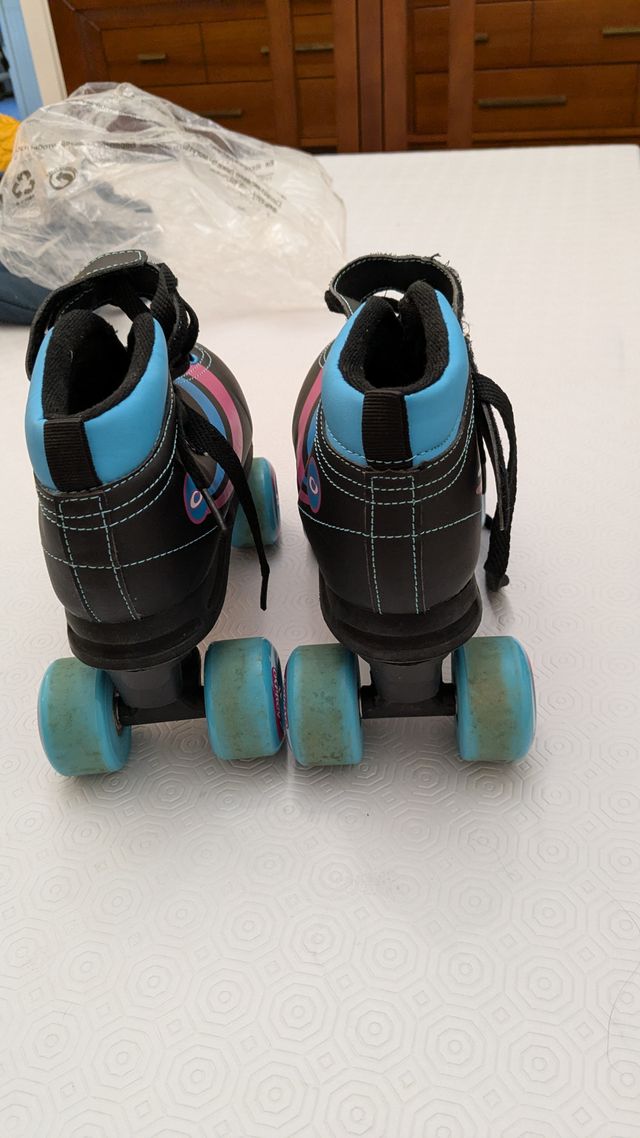 Vendo patines de ruedas para niños, en excelente estado, casi nuevos. - Diseño en color negro con detalles en azul y rosa. - Cierre con cordones y velcro. - Ruedas de color azul.