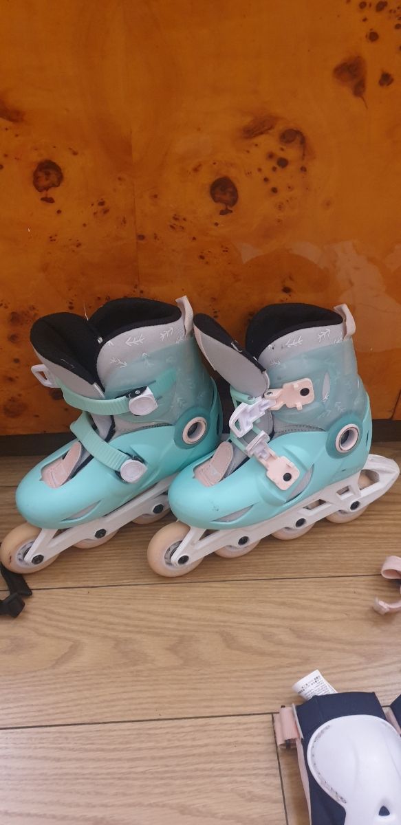 Detalles del productoPatines en línea de color turquesa y rosa, ideales para niñas. Son ajustables para adaptarse al crecimiento.