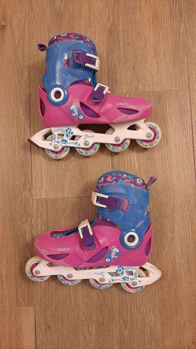 Detalles del productoPatines de 4 ruedas en línea Oxelo en color rosa y azul, ideales para iniciarse en el patinaje.
