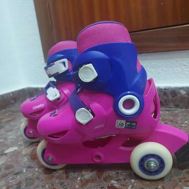 Patines en línea de Decathlon en talla 26-28. En buen estado - Cierre con velcro y hebilla. - Ruedas de patinaje. - Marca: Oxelo.
