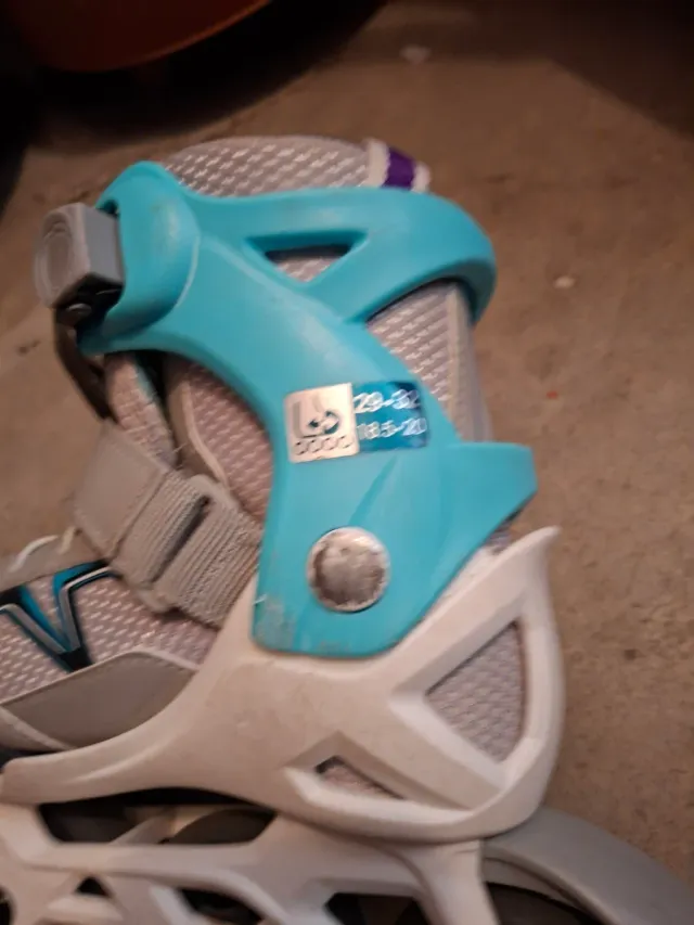 Patines ajustables de Decathlon en color azul y gris. - Talla ajustable de 29 a 32. - Longitud de pie de 18.5 a 20 cm. - Cierre de velcro y hebilla.